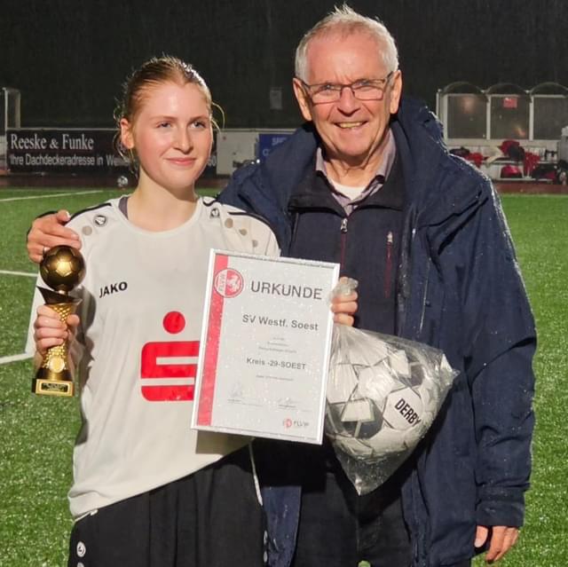 Zoe Meschede wurde mit 6 Treffern zur besten Torschützin des Turniers gekrönt und gewann die Torjägerkanone. Herzlichen Glückwunsch an die gesamte Mannschaft zu diesem großartigen Erfolg! Ein herzliches Dankeschön gilt auch dem FC Ense für die hervorragende Organisation des Turniers.