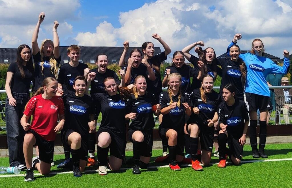 Einen Spieltag vor Saisonschluss sicherten sich unsere B-Mädchen heute die Meisterschaft in ihrer Kreisliga-Staffel Gütersloh. Mit 4:1 besiegten sie die JSG Neubeckum-Vellern und führen nun die Tabelle uneinholbar mit 5 Punkten Vorsprung an. Die heutigen Tore erzielten Olisa Ajeti, Jasmin Podgorski, Kaschka Krüger und Carla Bottin. Das ist bereits ein Riesenerfolg für das Team von Andreas Kautza und Thomas Urbach. Aber es soll ja noch weitergehen. Ab Anfang Juni stehen dann die Aufstiegsspiele zur Bezirksliga an. Einen großen Teil zur Meisterschaft haben übrigens auch unsere C-Juniorinnen beigetragen, denn sie unterstützten den knappen B-Kader während der gesamten Saison.