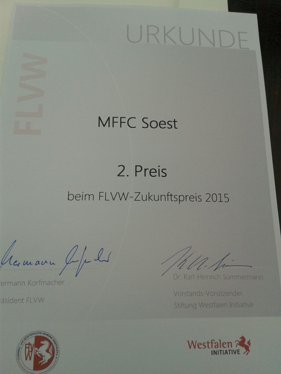 Im Rahmen eines Festaktes  im Mannheimer Rosengarten anlässlich der 40 Jahr- Feier der Sepp-Herberger Stiftung wurden die Sepp-Herberger Urkunden verliehen. Insgesamt 13 Preisträger erhielten in den Kategorien Behindertenfußball, Resozialisierung, Schule und Verein, Fußball Digital sowie Sozialwerk die mit Geld- und Sachpreisen dotierten Auszeichnungen.  In Anwesenheit zahlreicher Ehrengäste und Kuratoriumsmitgliedern der Stiftung, u.a. Uwe Seeler, Horst Eckel, Dieter Kürten und Otto Rehhagel, wurde der MFFC Soest nun auch mit der Sepp-Herberger Urkunde in der Kategorie Schule & Verein ausgezeichnet. Es war der DFB-Präsident Grindel höchstpersönlich, der MFFC-Abteilungsleiterin Petra Brotte in Begleitung ihres Ehemannes Wolfgang  die Urkunde und den damit verbundenen Geldpreis von 2.000 Euro übergab. Grundlage für diese Auszeichnung war die gute Jugendarbeit des MFFC Soest im Mädchenbereich, ausgehend von einer Schulfußball-AG mit der Soester Georgschule bis hin zur Etablierung einer eigenständigen Abteilung im Spielverein Westfalia Soest. Zur Zeit stellt die Abteilung mit ca. 100 aktiven Mitgliedern drei Mädchenmannschaften ( B, C, und E-Juniorinnen) und ein Frauenteam. In der nächsten Saison kommt sogar noch eine F-Juniorinnenmannschaft hinzu.  Petra Brotte freute sich sehr über diese Auszeichnung, die sie stellvertretendend für alle Trainer und Betreuer des MFFC entgegennehmen konnte. Petra Brotte: „Ich bin sehr stolz,  diese Ehrung für unser gesamtes Team erhalten zu haben. Die Urkunde wird einen besonderen Platz in unserem Vereinsheim bekommen, der Geldpreis wird zu 100 % unseren Mädchen zu Gute kommen. Rundum war es ein gelungener Abend, denn nicht nur der Austausch mit den bekannten Fußballgrößen war eine Bereicherung – auch konnten wir gute Kontakte zu anderen Preisträgern knüpfen, die ebenfalls im Mädchenfußball zuhause sind!“
